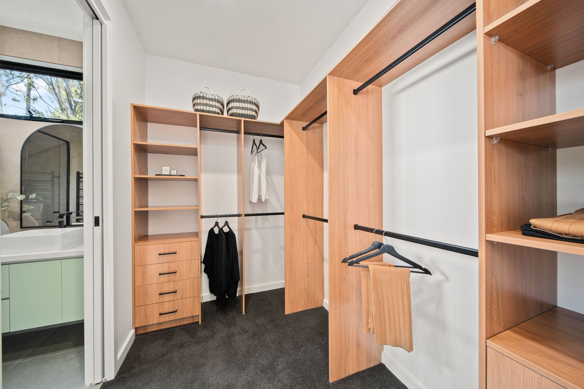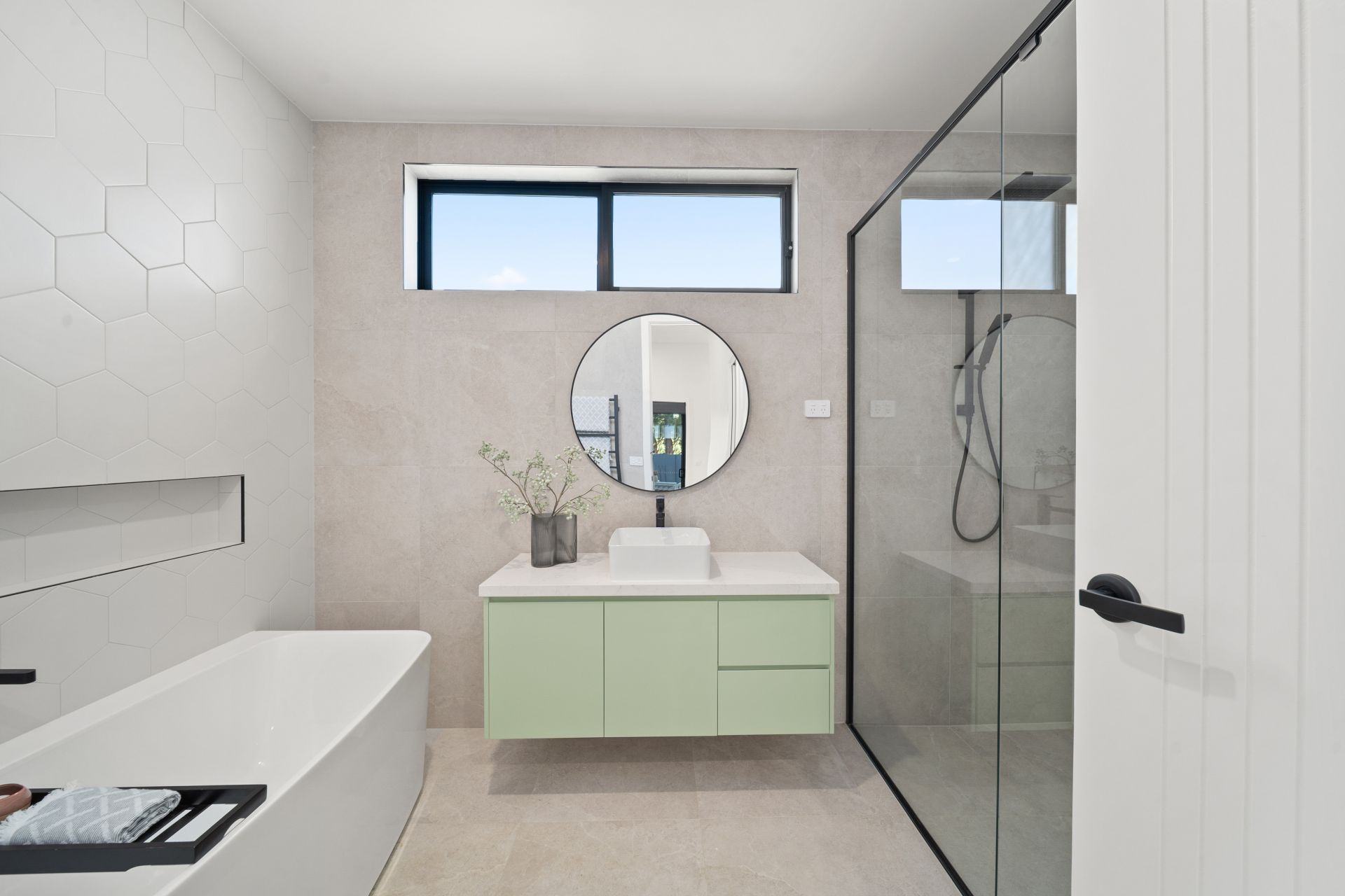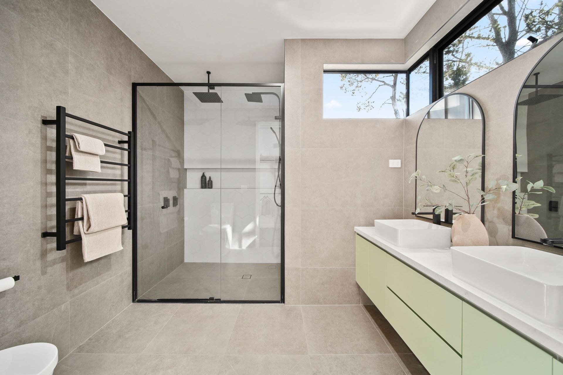 – Custom wall hung vanities and designer fixtures to all bathrooms