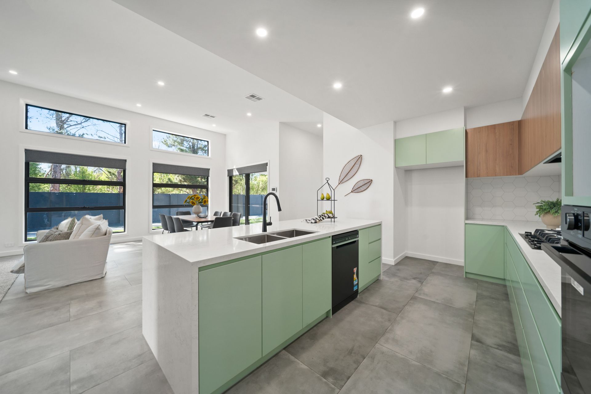 Stepping inside, you’re greeted by striking imported Italian tiled floors that flow through the home’s open and light-filled interiors. The heart of the home is the designer kitchen, which overlooks the vast family and meals area. Featuring premium Westinghouse appliances, 40mm stone benchtops, and a butler’s pantry, this kitchen combines form and function with stunning finishes – including marble-inspired stone and an elegant hexagonal tiled splashback.