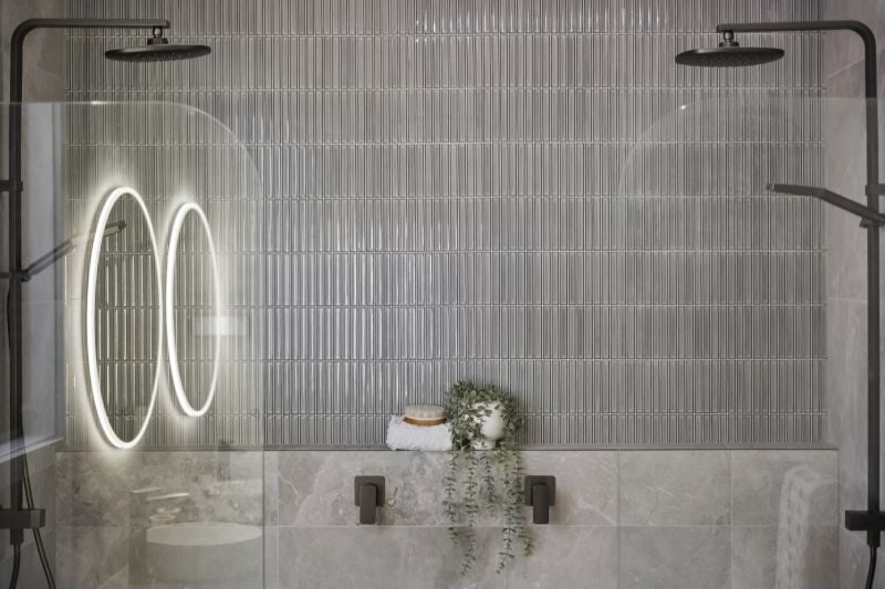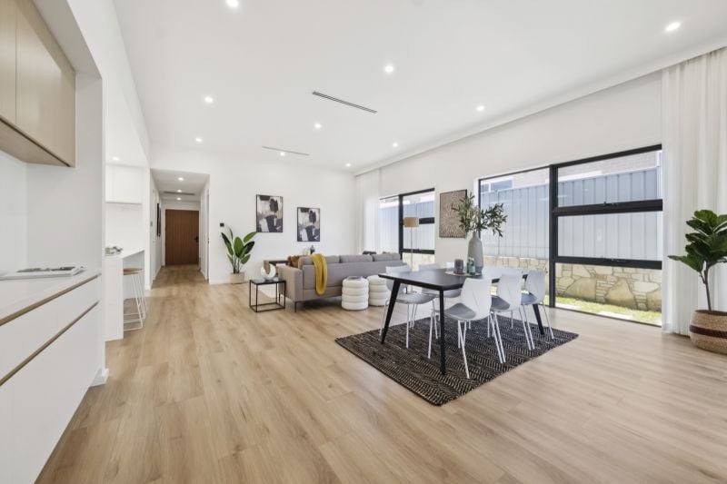 The heart of the home is a chef-inspired kitchen, crowned by a skylight and featuring luxurious 40mm stone benchtops with a waterfall edge. It is equipped with a full suite of Fisher & Paykel appliances, soft-close cabinetry, and a large butcher’s pantry. Flowing seamlessly from the kitchen is the open-plan living and dining area, complemented by a second living space perfect for an home office or children’s play area.