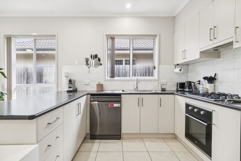 At the heart of the home, the well-appointed kitchen offers ample bench space and quality appliances including gas cooking, an electric oven and dishwasher. This space flows seamlessly into the open-plan dining and living area, where large windows frame the rear yard and invite abundant natural light.