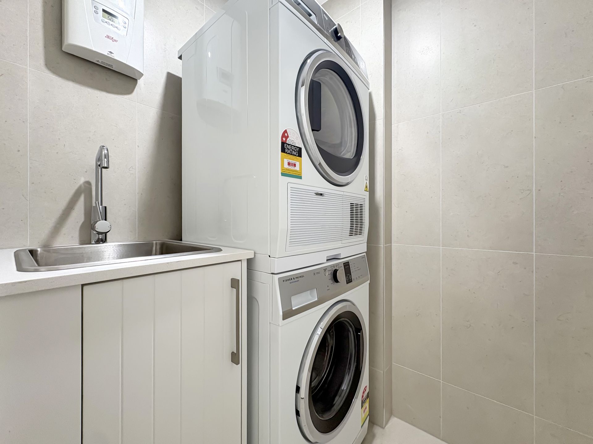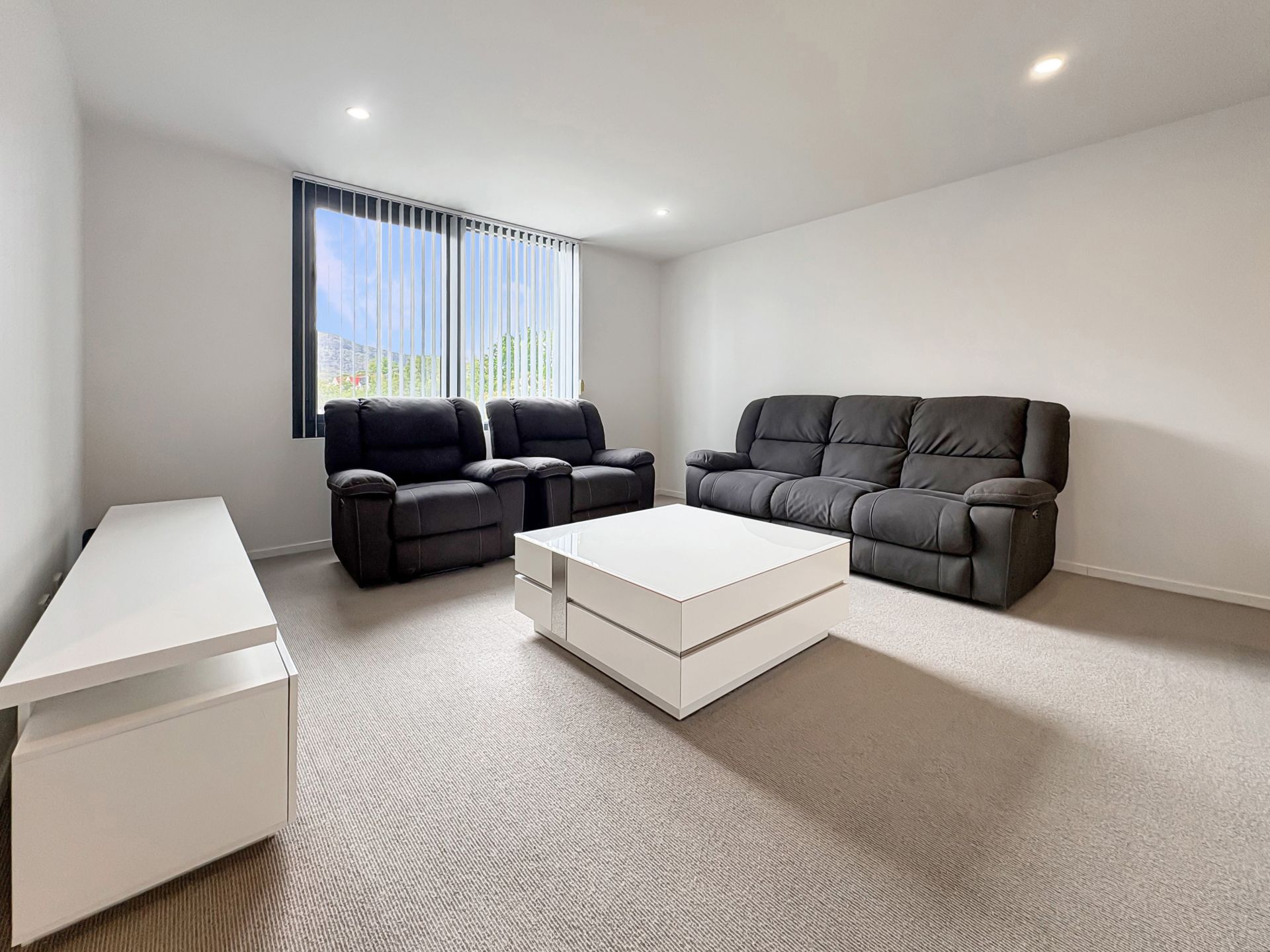 This property is partially furnished, including couches, coffee table, entertainment unit, round glass dining table with four chairs, fridge, washing machine and dryer — making it easy to move straight in.