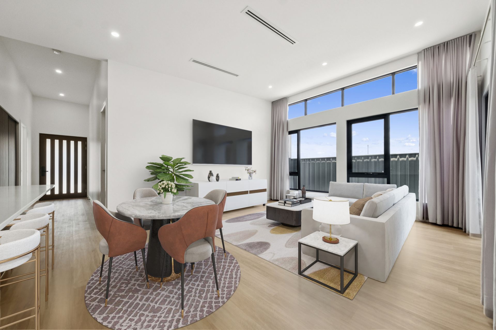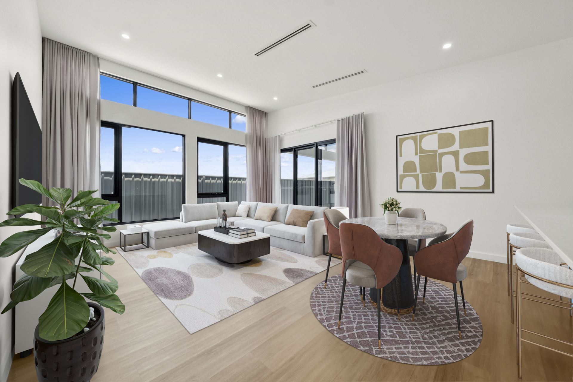 + Spacious open plan living and dinning area with raked ceiling and high windows