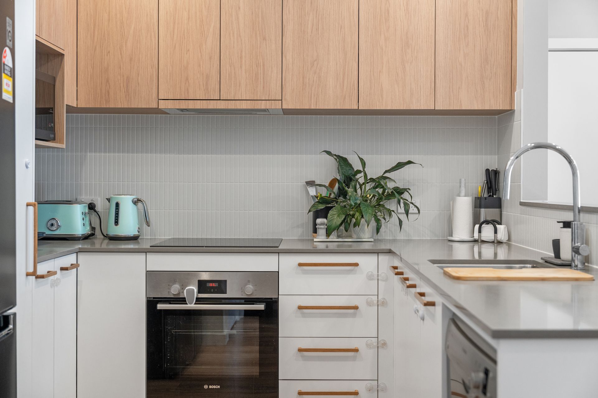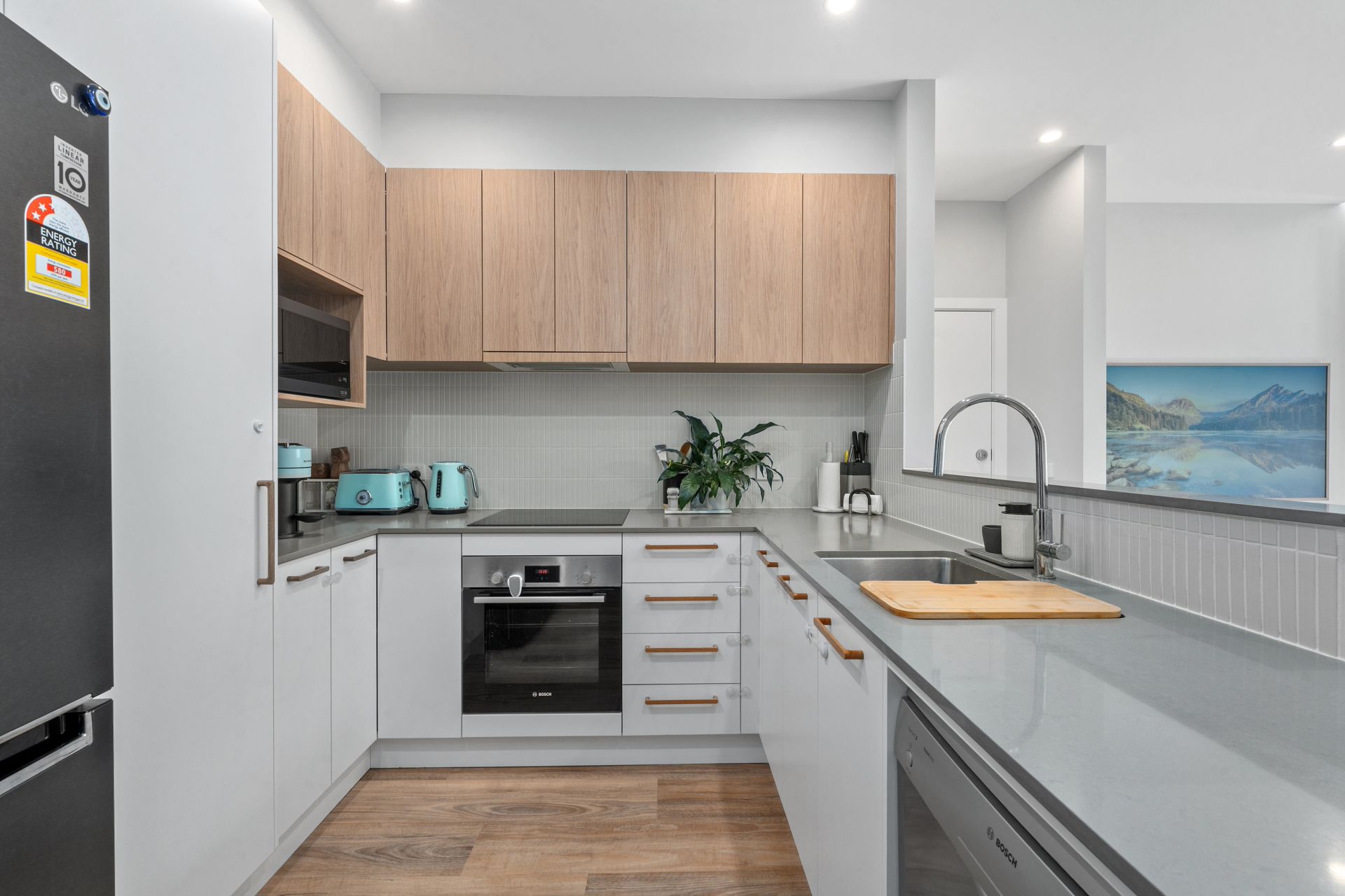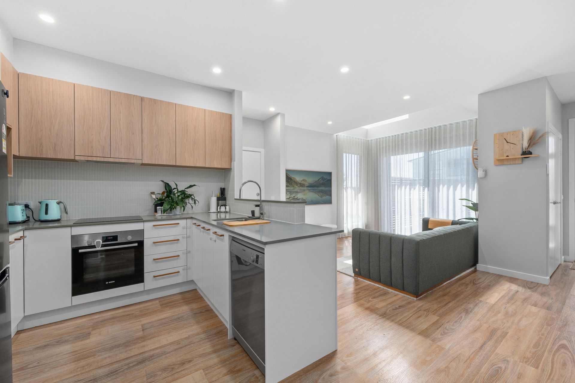 The kitchen is designed for both everyday living and entertaining, complete with stone benchtops and quality Bosch appliances including an induction cooktop, oven and dishwasher.