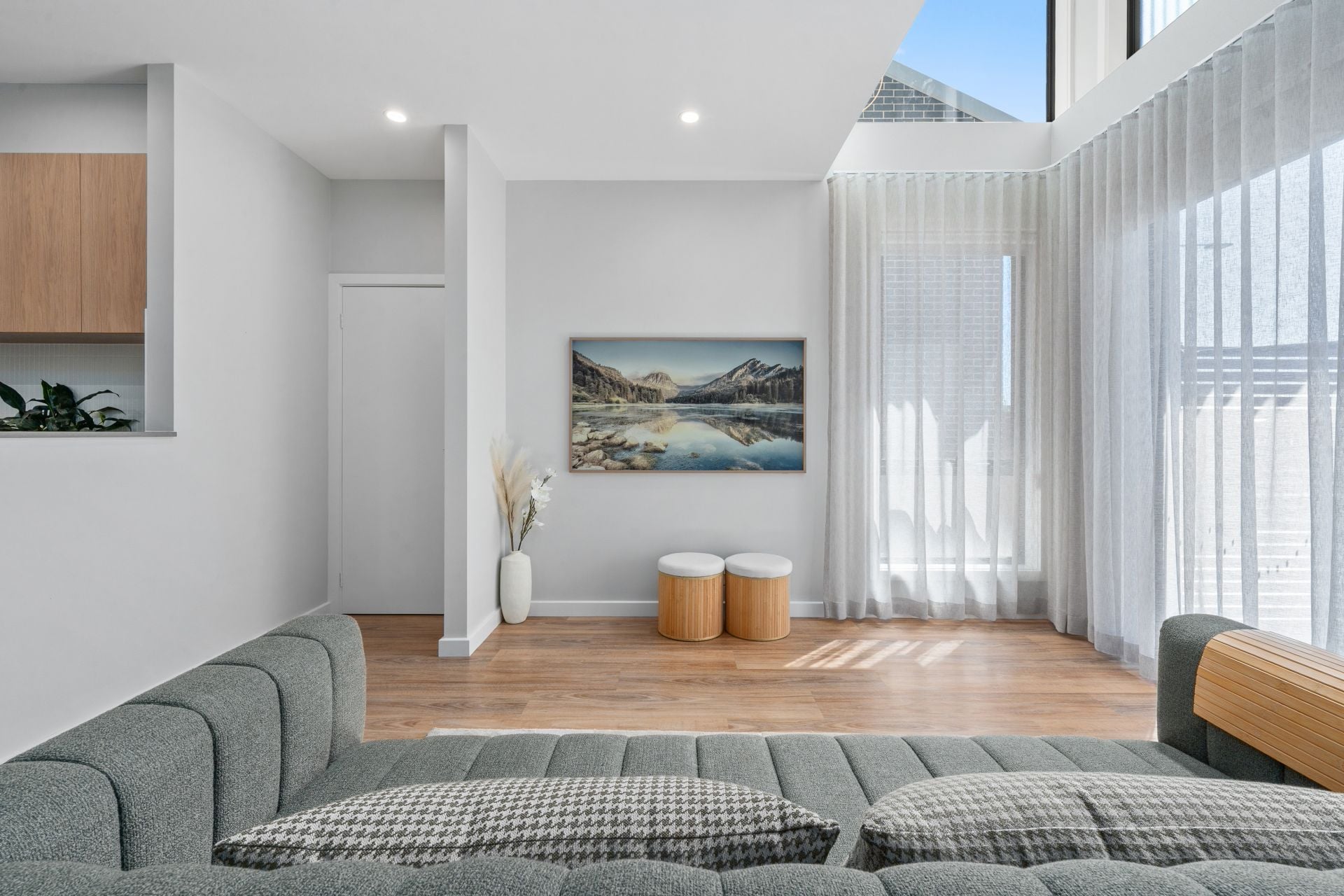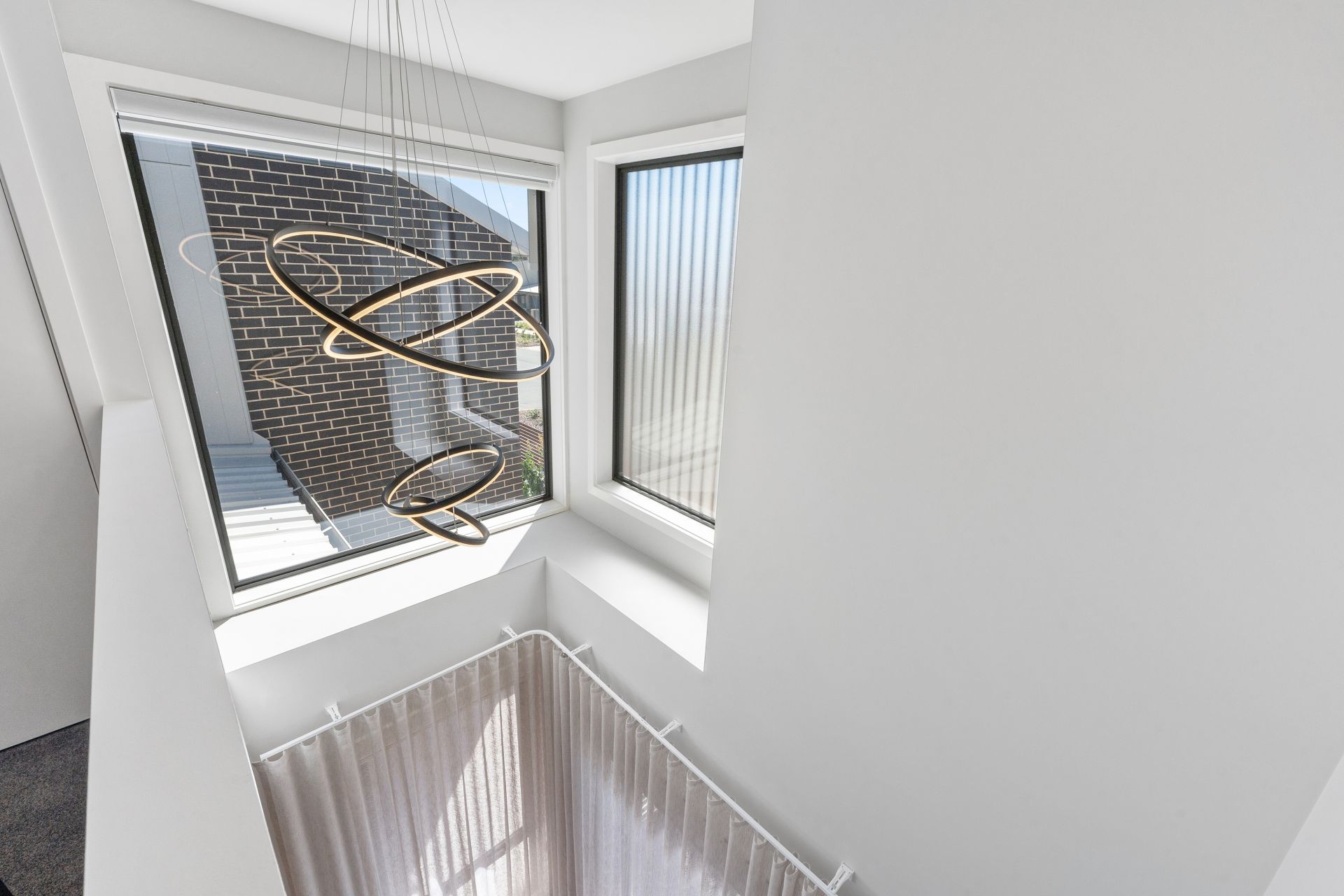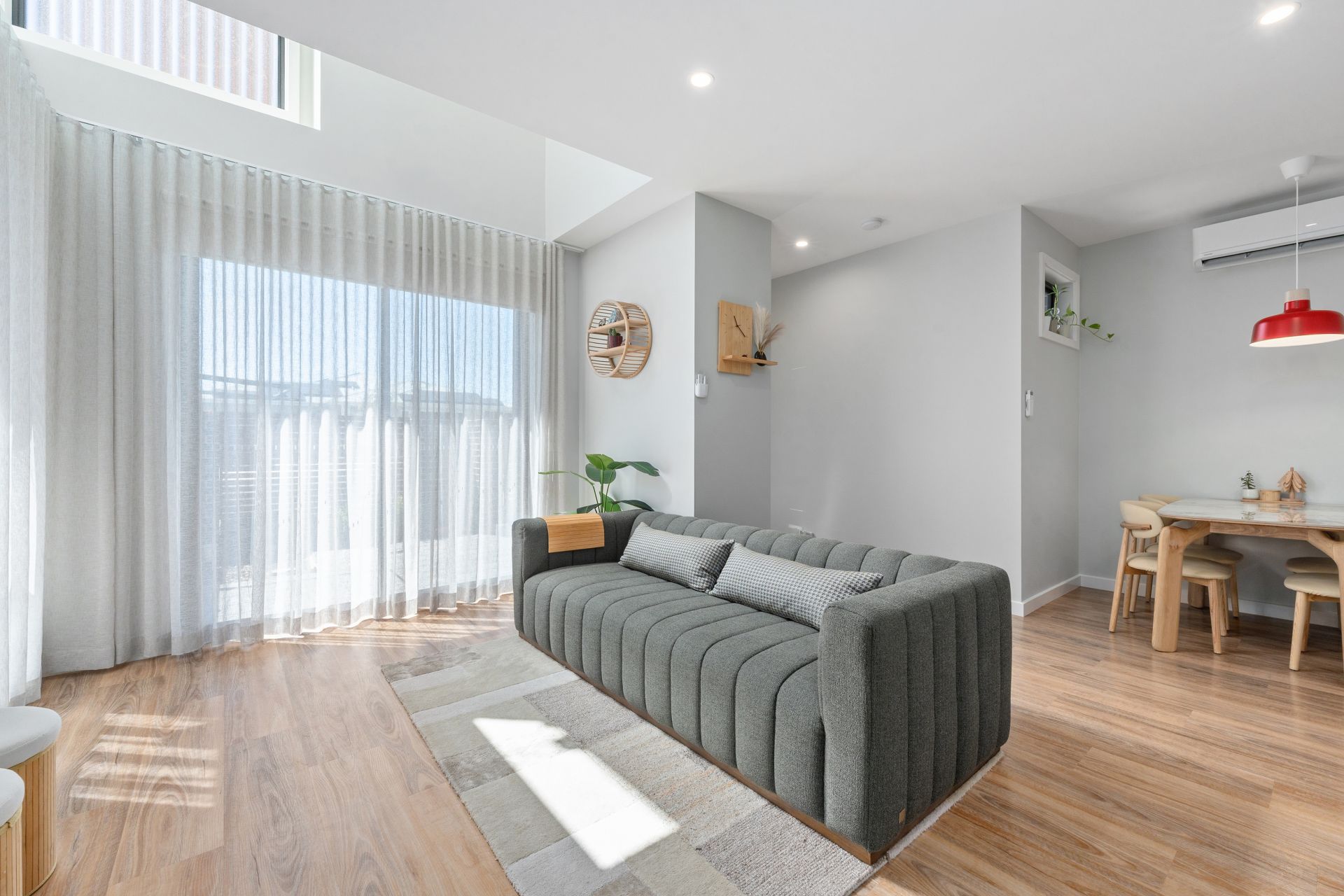 Step inside and you’ll immediately notice the soaring cathedral ceiling in the main living area, highlighted by a striking modern LED chandelier and elegant S-fold sheer curtains that run floor to ceiling, creating a light-filled, luxurious feel. Hybrid flooring downstairs, a dedicated dining space and an additional family room upstairs mean you’re not confined to one living zone – you can relax, entertain or work from home with ease.