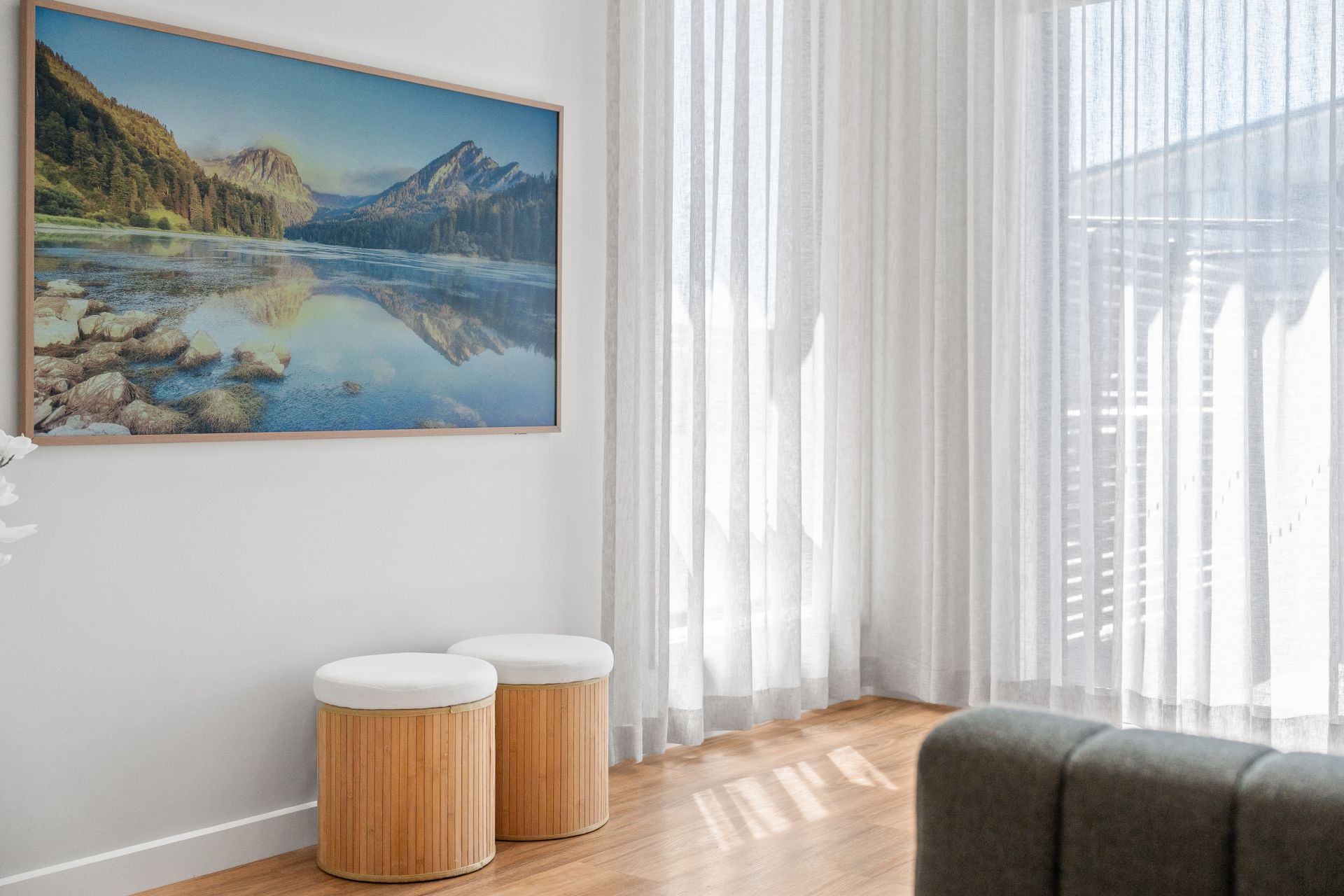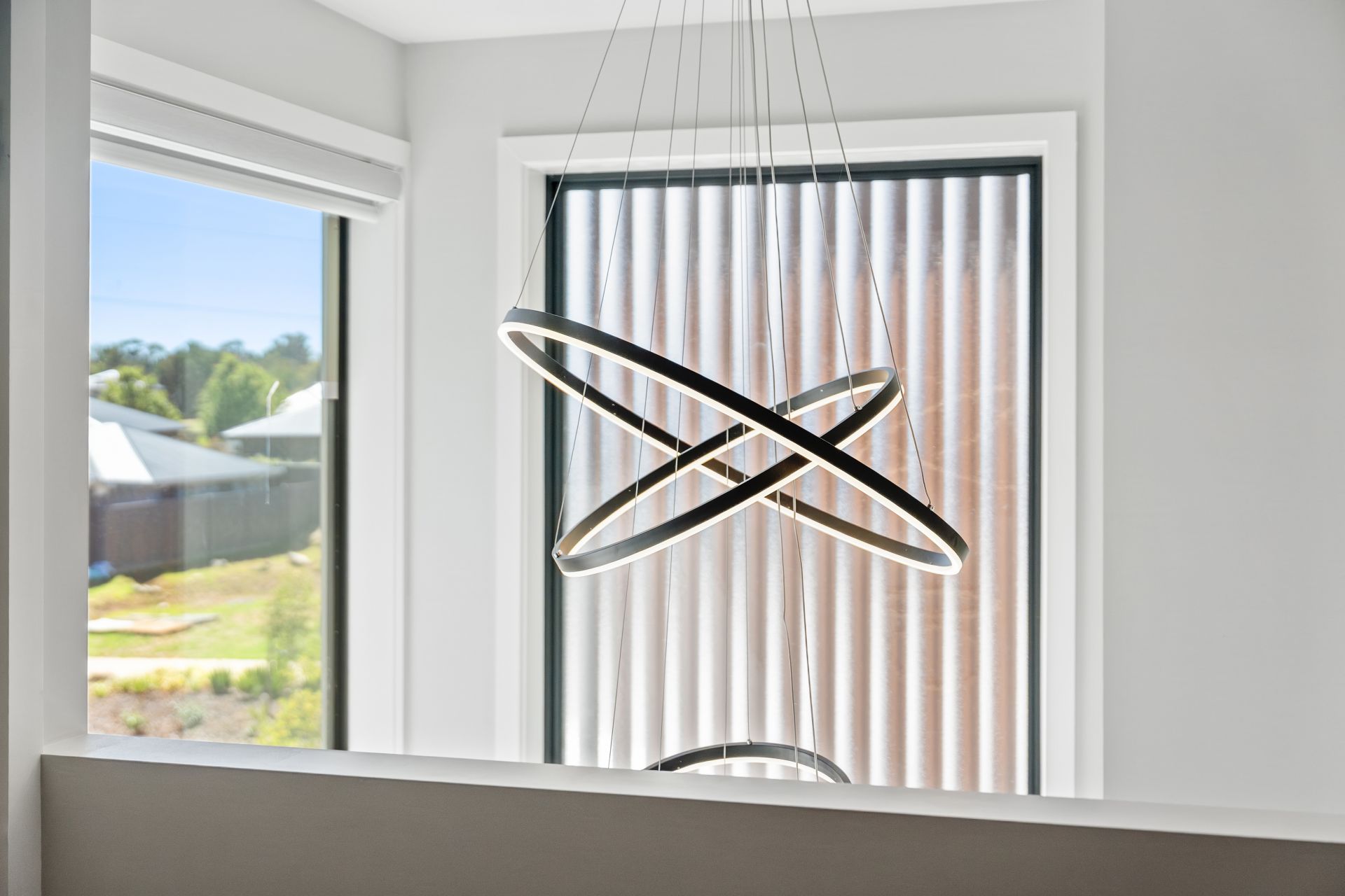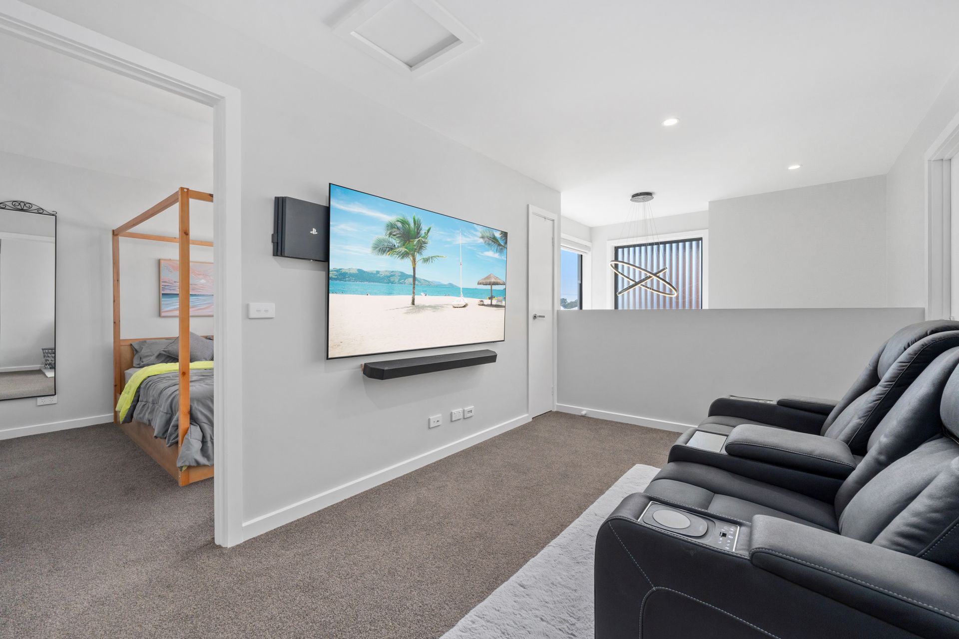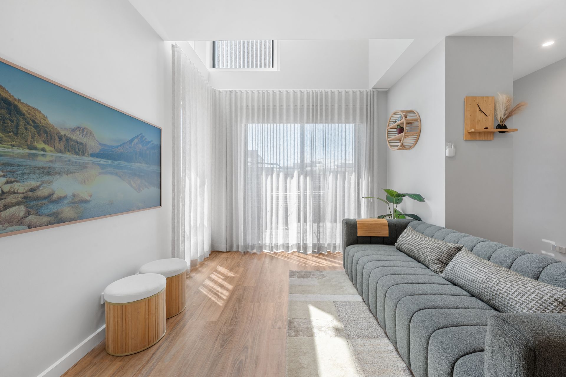 Step inside and you’ll immediately notice the soaring cathedral ceiling in the main living area, highlighted by a striking modern LED chandelier and elegant S-fold sheer curtains that run floor to ceiling, creating a light-filled, luxurious feel. Hybrid flooring downstairs, a dedicated dining space and an additional family room upstairs mean you’re not confined to one living zone – you can relax, entertain or work from home with ease.