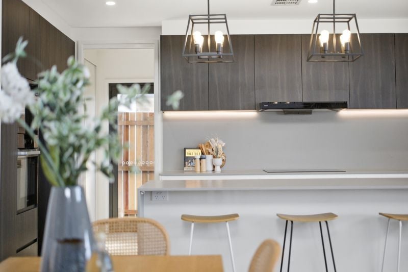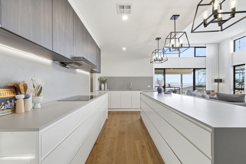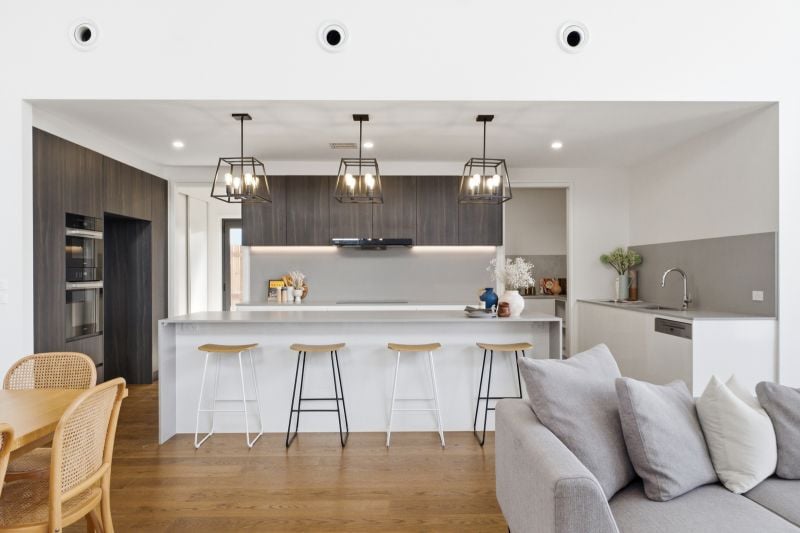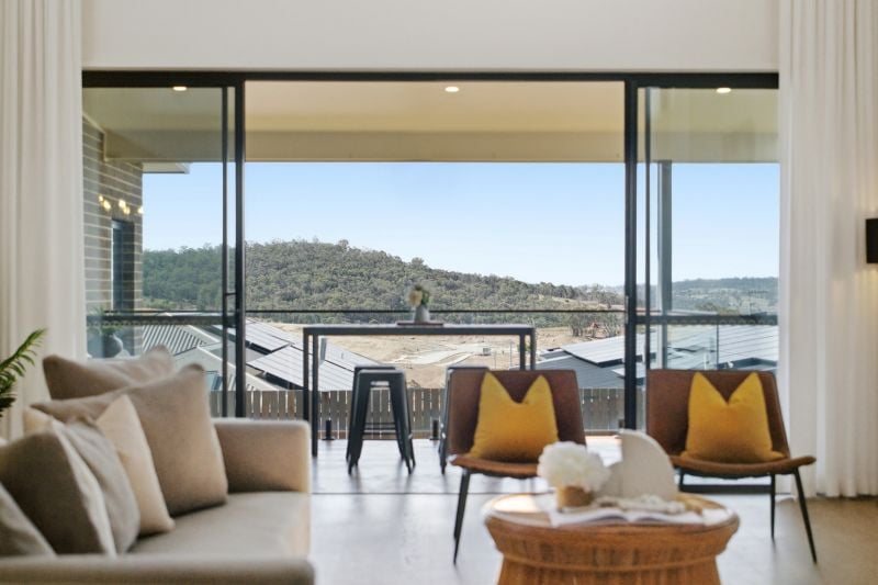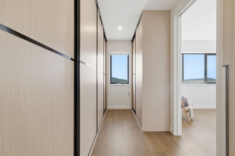 The residence’s heart is a light-filled, open plan living and dining area, accentuated by a dramatic 4.6m high ceiling and electric highlight windows, inviting natural light to dance across the expansive space. Sliding windows seamlessly connect this central hub to the alfresco area at the rear, revealing breathtaking 180-degree views across Canberra-an entertainer’s dream.