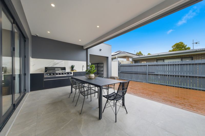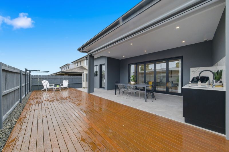 The transition to outdoor living is effortless through glass doors that lead to a substantial alfresco area. This space is equipped with a full outdoor kitchen and all wrapped in expansive decking. Sustainability and security are woven into the home’s DNA, featuring a 10kW solar system, double-glazed windows with quality sheer curtains, a video intercom, and a comprehensive security camera system.