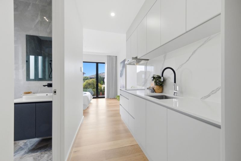 Accommodation is designed with unparalleled flexibility and privacy in mind. The upper level serves as a private retreat, anchored by a master suite that rivals the world’s finest hotels. This sanctuary features spacious walk-in robes, a luxurious ensuite with under-tile heating, and a private balcony offering stunning panoramic views. A secondary guest bedroom with its own ensuite also resides upstairs, alongside two additional bedrooms serviced by a main bathroom featuring a bathtub. A dedicated upstairs sitting area with a wet bar provides direct access to the balcony, creating a perfect space for evening relaxation.