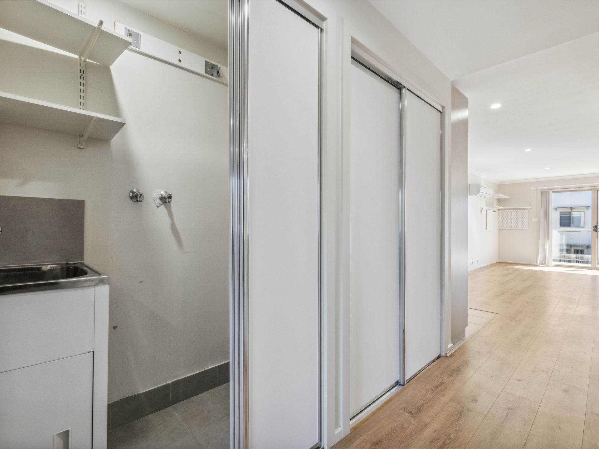 The apartment features a generous open plan layout with new laminate flooring throughout, a modern kitchen, and direct access to a private balcony. The well-sized bedroom includes built-in wardrobes and easy two-way access to the bathroom.