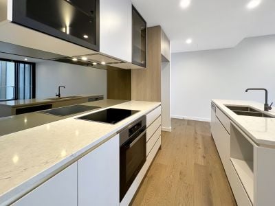 The kitchen presents stone benchtops and Miele Appliances throughout. With ample storage, as well as back lit display cabinetry above. Timber floorboards from the entrance throughout to the open plan living space leading to the balcony showing a straight ahead view of Lake Burley Griffin and to your right, Black Mountain and the Telstra Tower.