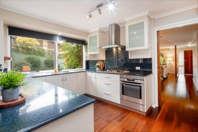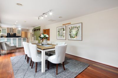 Step inside to discover the warm ambiance of the open-plan lounge and dining areas, complemented by separate family, rumpus, and study. Stretching throughout is stunning timber flooring and framing each garden view are luxurious drapes. At the heart of the home, you'll find the custom-designed kitchen with stone benchtops, built-in AEG/Electrolux built-in steam oven and dishwasher, large, functional pantry, and soft-close drawers and cupboards.