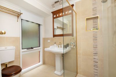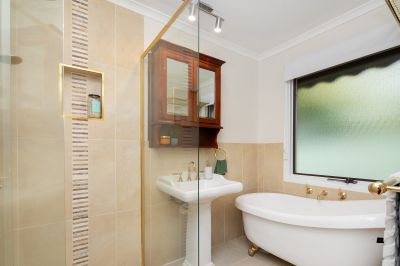 At the front of the home, you can retreat to the segregated lower-level master bedroom, complete with a well-equipped walk-in wardrobe and gorgeous ensuite for added privacy and comfort. The four remaining bedrooms each feature inbuilt custom wardrobes, ensuring ample storage space for all residents. The lower bedrooms share a stunning bathroom with a claw foot bath for long soaks at the end of the day and separate toilet.