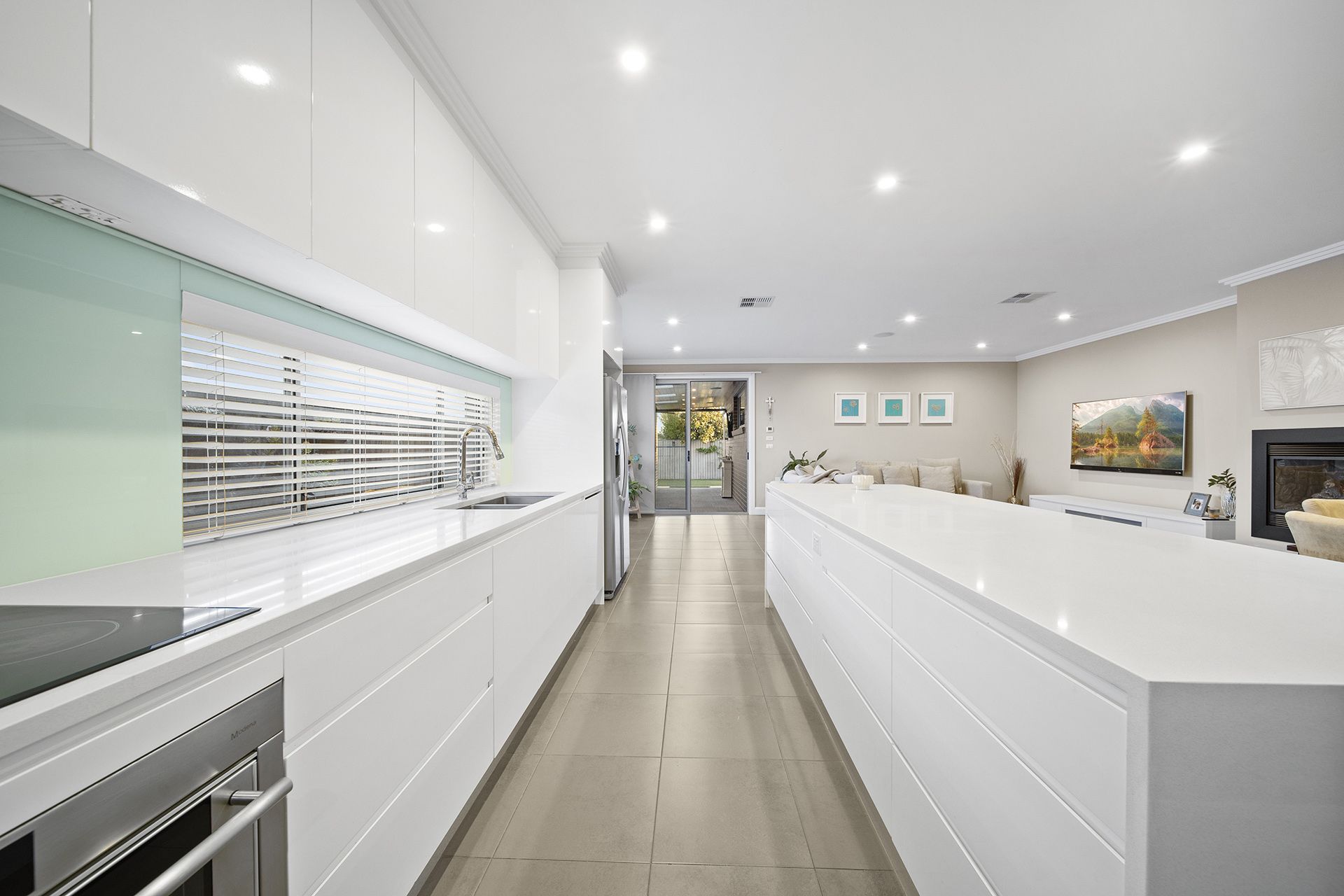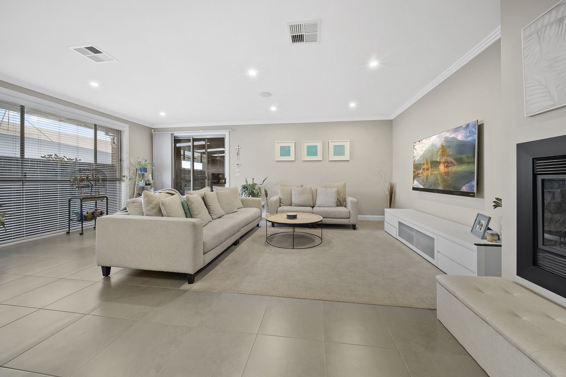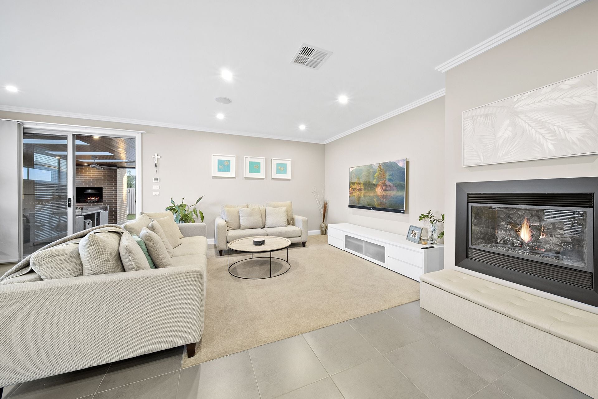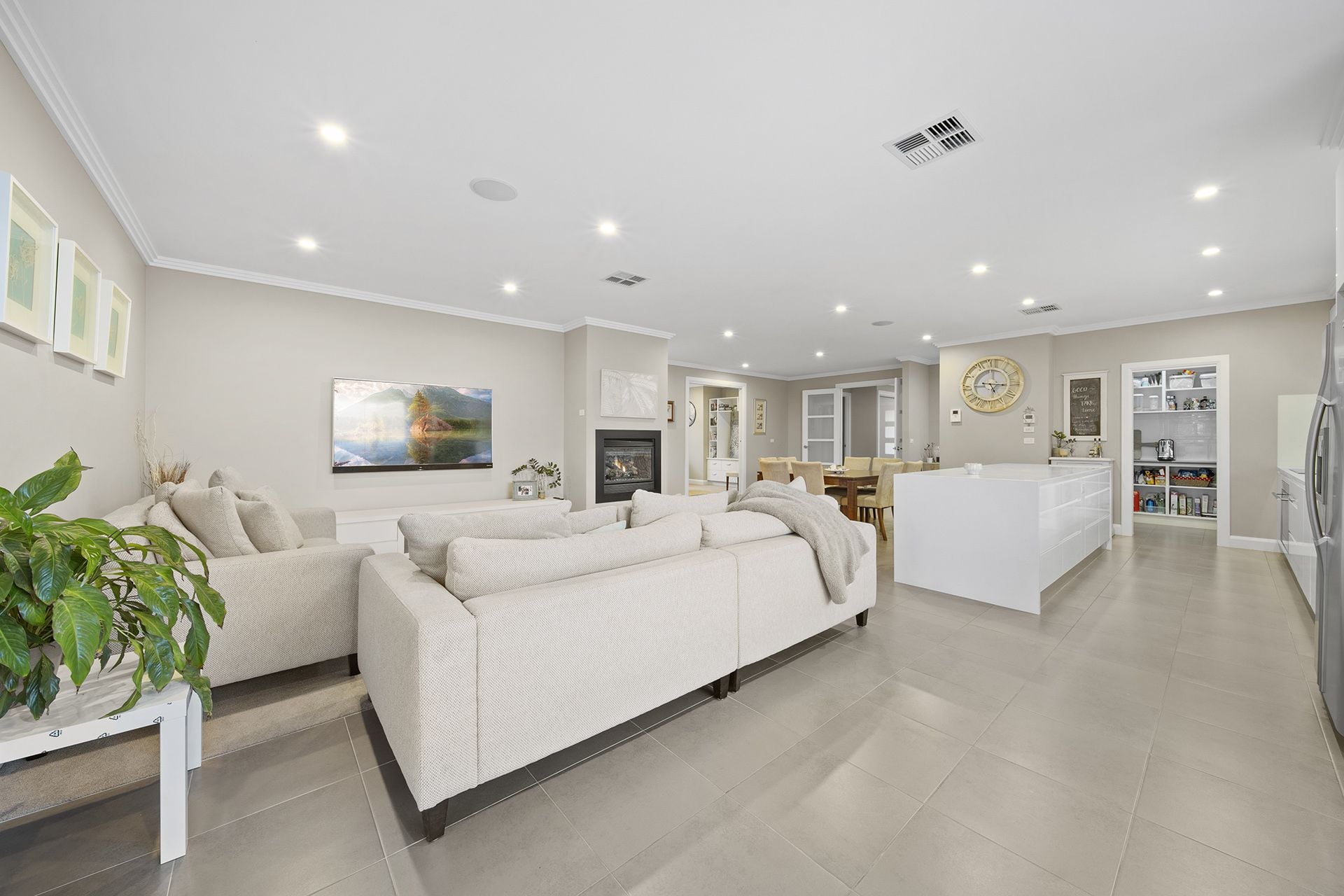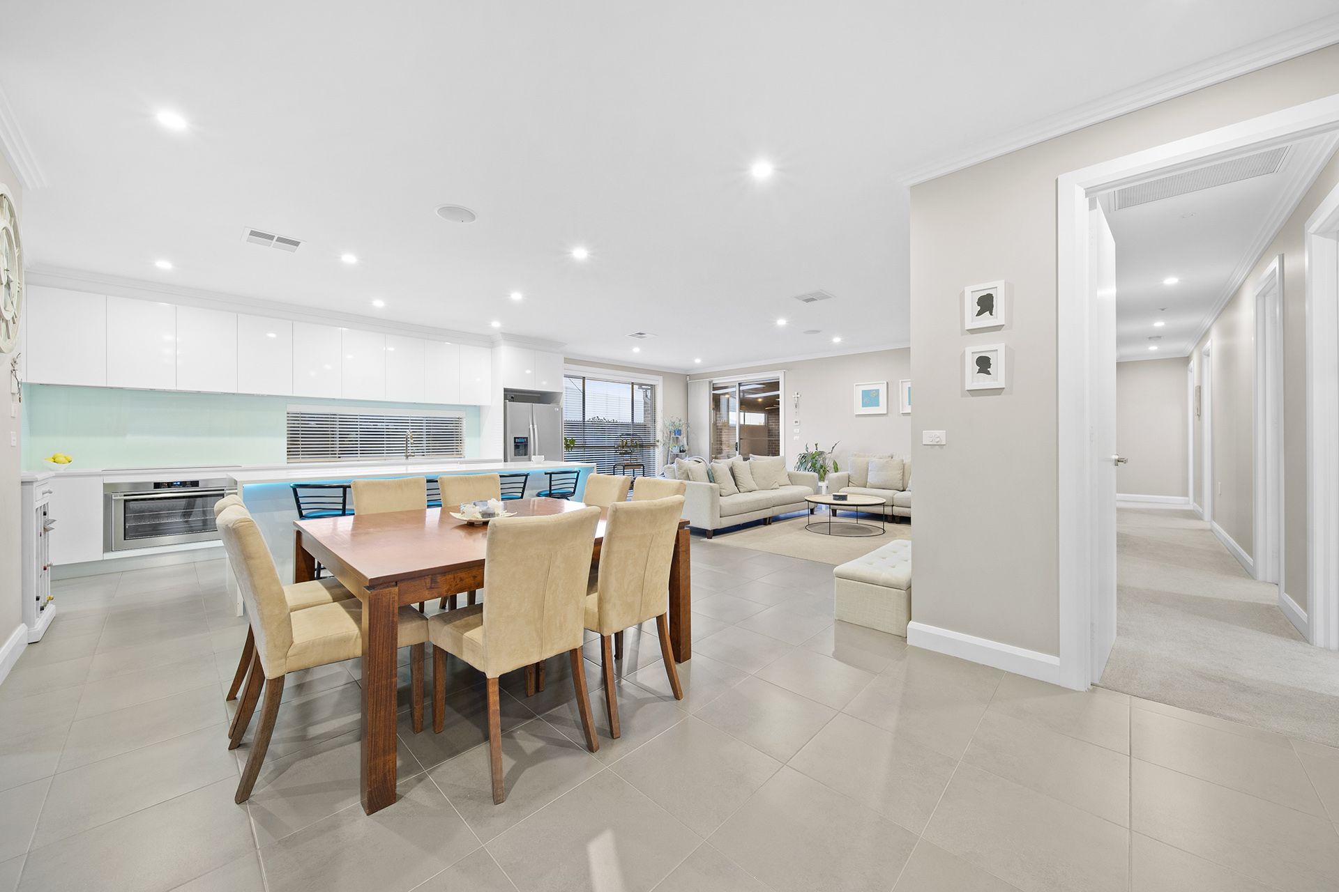 The heart of the home is the grand open-plan living and dining area, featuring built-in theatre speakers and a cozy natural gas fireplace, perfect for entertaining or relaxing evenings. The impressive modern kitchen, boasts ample storage, an island bench, and a practical butler’s pantry. This kitchen is a chef’s dream and is equipped with high-end Italian-made 900mm oven and 900mm electric cooktop.