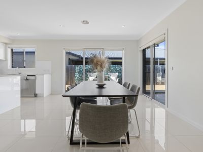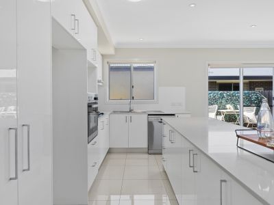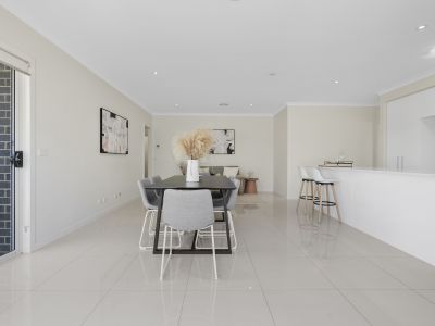 Upon entry, one is greeted with a formal living room, a serene retreat perfectly positioned at the front of the home. Flowing effortlessly to the rear is a spacious, light-filled open plan living and dining area, adjoining a sleek kitchen that boasts beautiful stone benchtops, a breakfast bar, a walk-in pantry, and a suite of quality BOSCH appliances. The layout is as functional as it is elegant, ensuring culinary exploits are both enjoyable and convenient.