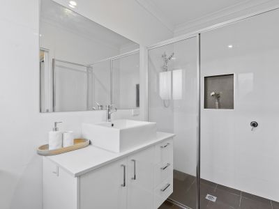 The master bedroom is a sanctuary of space and light, featuring an oversized walk-in robe and an ensuite, while three additional well-appointed bedrooms come complete with built-in robes and are serviced by a main bathroom that includes a luxurious bathtub, a separate shower, and a toilet.