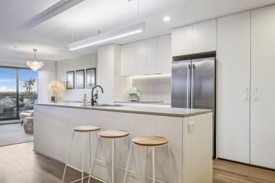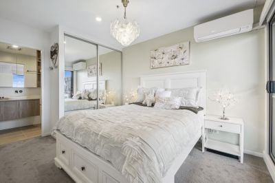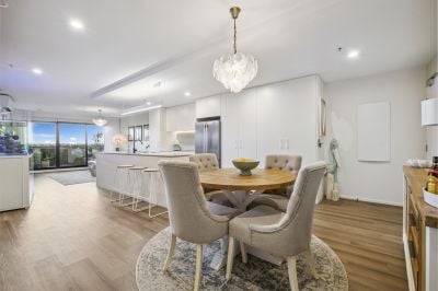 The master bedroom features a private ensuite and balcony access, while both bedrooms include built-in robes and generous proportions. High ceilings and premium window treatments enhance the airy, light-filled interiors throughout.