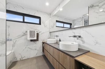 Discover a home designed for elegant and practical living. Downstairs, a guest bedroom with a walk-in robe and luxurious ensuite offers privacy for visitors. Two additional bedrooms with built-in robes are serviced by the main bathroom. Upstairs, the master suite is a sanctuary with a walk-in robe, ensuite, and a private balcony to soak in the stunning views. The other two bedrooms and a spacious upstairs living area with a patio provide a perfect escape.