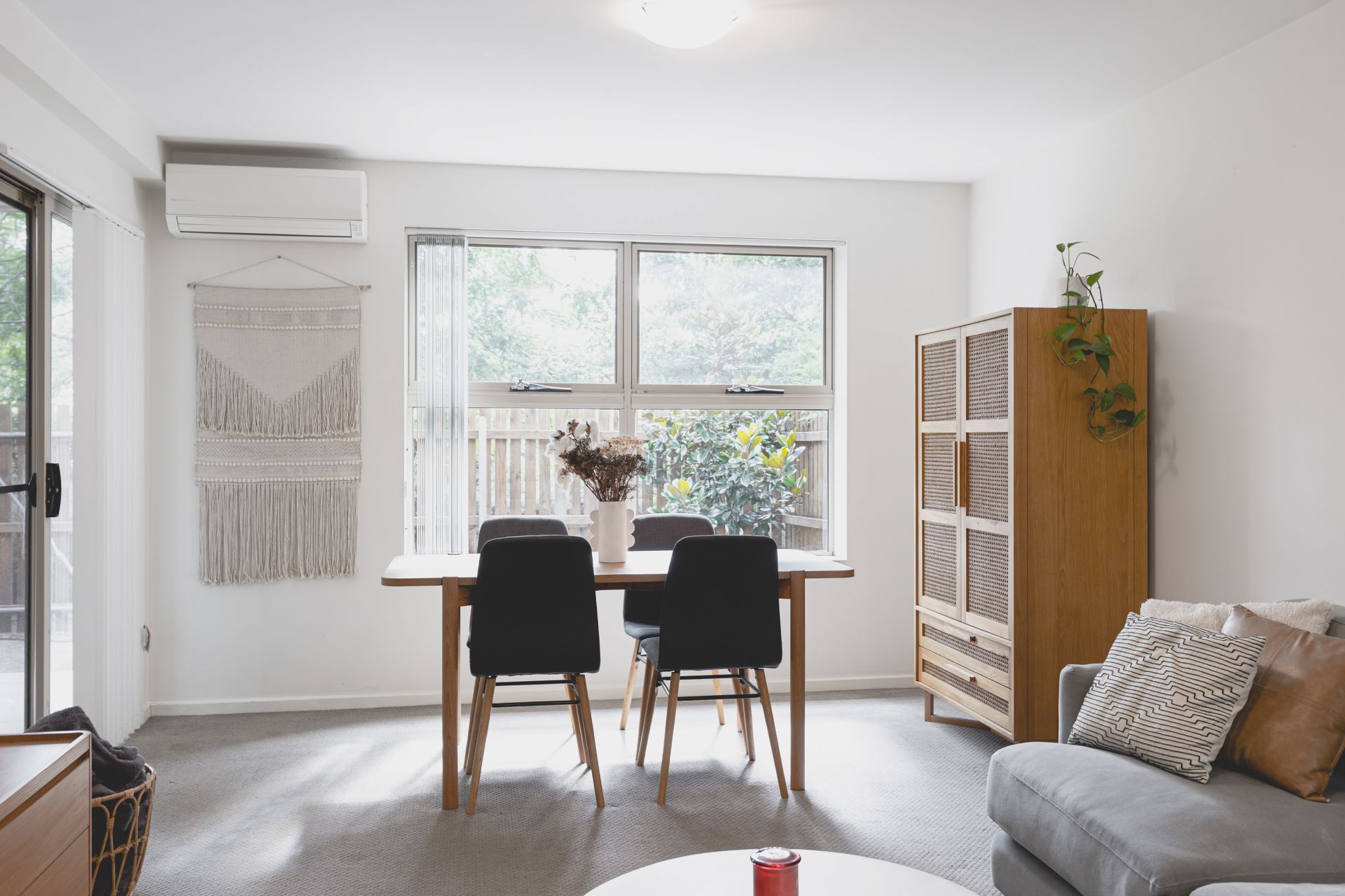 The well-appointed kitchen features ample storage and quality electric appliances, making meal preparation effortless. An open-plan living area seamlessly extends to the courtyard, creating a bright and inviting space. A reverse-cycle split system ensures year-round comfort, while quality window furnishings enhance privacy and ambiance throughout.