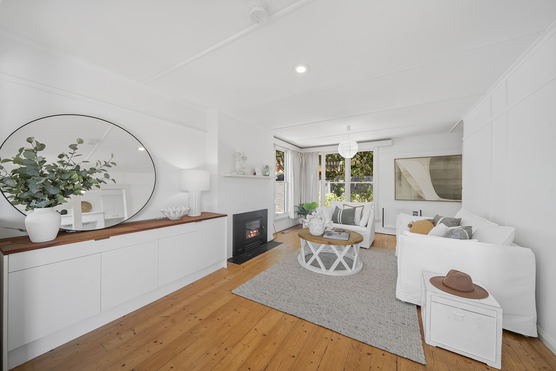 The home's original features have been thoughtfully restored, including the hardwood floorboards throughout the living spaces with new insulation. A modern, efficient, high-performance fireplace has been installed for cozy winter evenings, providing the perfect setting to relax or host guests.
