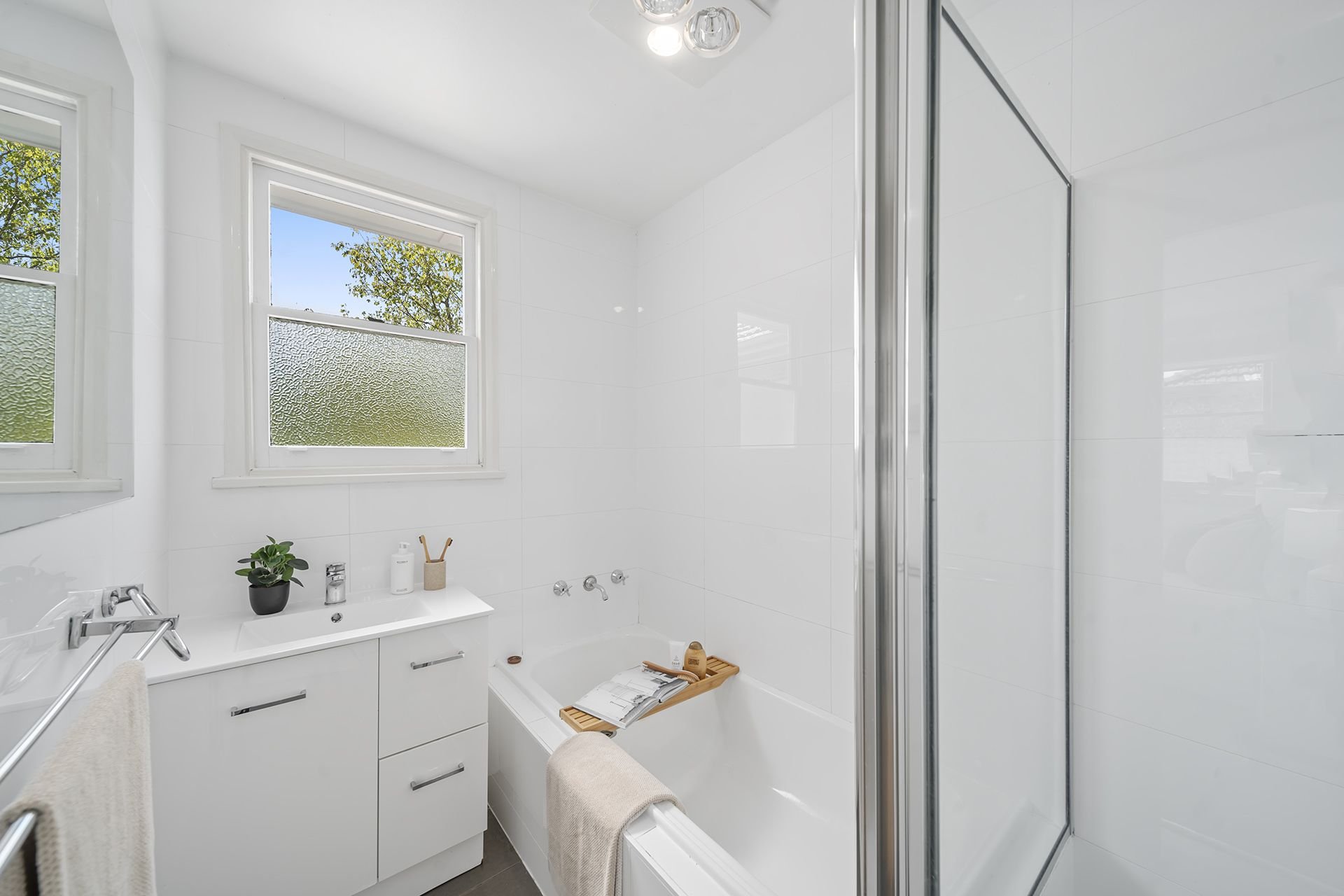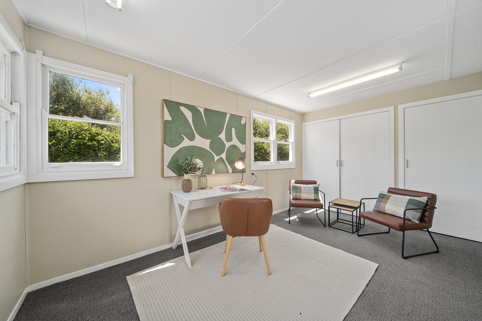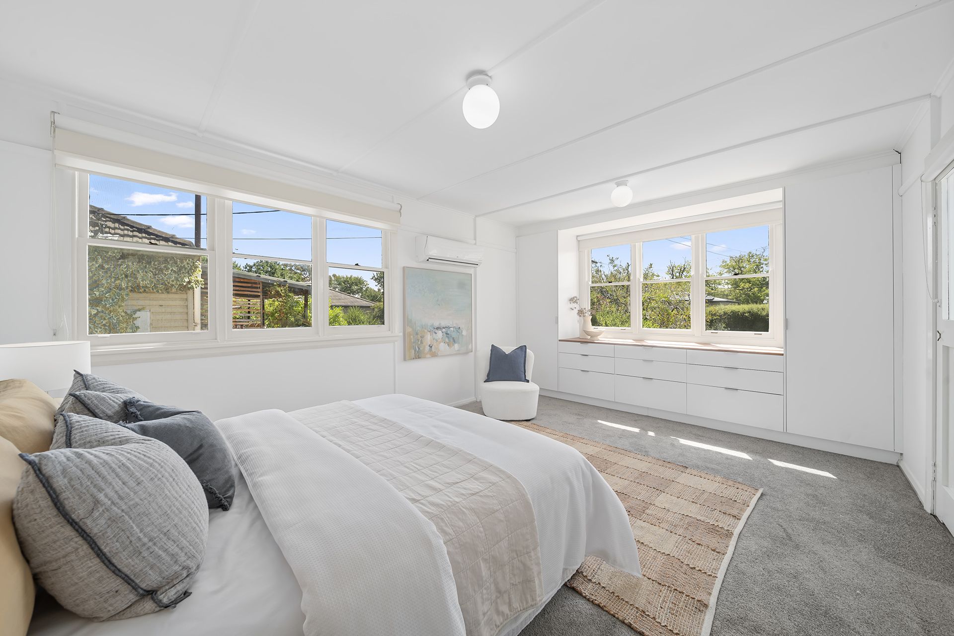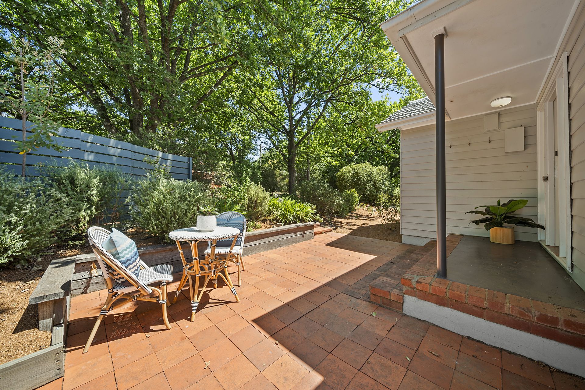 The three bedrooms are well-sized and tastefully restored. Bedroom one is spacious with a large built-in robe, while Bedroom two features a wall heater for added coziness. The master bedroom is a retreat, offering new built-in cupboards and private access to the peaceful deck where you can relax and enjoy the leafy surroundings. The main bathroom includes a separate shower and bath. A separate laundry with a sink, storage, and external access makes household tasks simple and efficient.