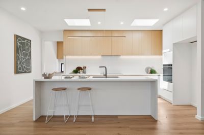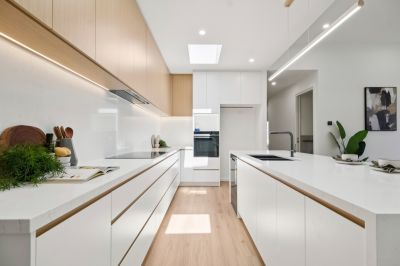 The heart of the home is a chef-inspired kitchen, crowned by a skylight and featuring luxurious 40mm stone benchtops with a waterfall edge. It is equipped with a full suite of Fisher & Paykel appliances, soft-close cabinetry, and a large butcher's pantry. Flowing seamlessly from the kitchen is the open-plan living and dining area, complemented by a second living space perfect for an home office or children's play area.