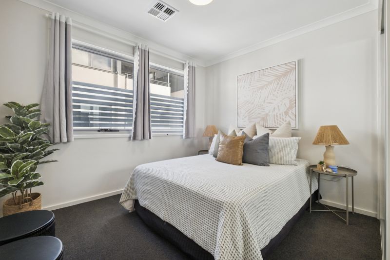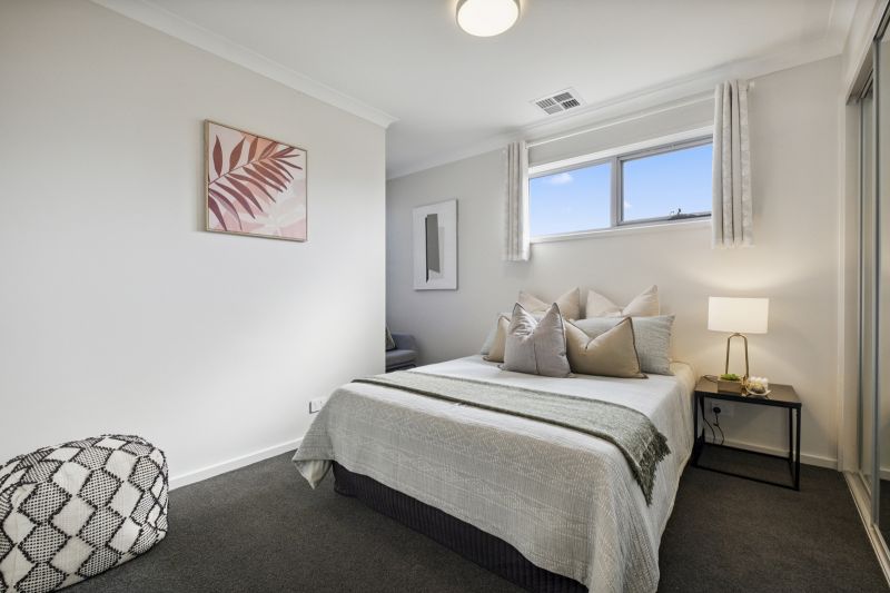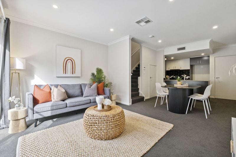 The townhouse’s clever layout extends to the outdoor spaces, featuring an easy maintenance courtyard perfect for alfresco dining and unwinding in the fresh air. Upstairs, the master bedroom with its built-in wardrobe and modern ensuite is a private sanctuary, while the two additional bedrooms, each with built-in wardrobes, are serviced by the main bathroom, ensuring ample space for all.