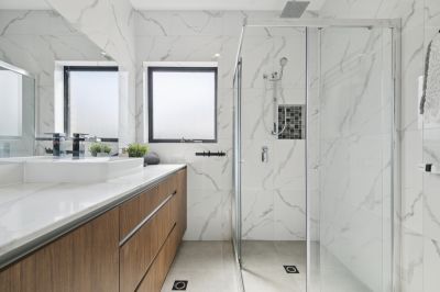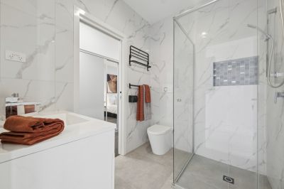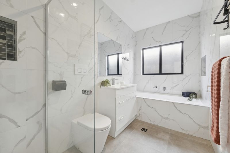 The master bedroom is a true sanctuary, with a walk-in robe, stylish dresser, and a sumptuous ensuite. A versatile guest bedroom offers access to a two-way bathroom, enhancing both convenience and privacy. Two additional well-proportioned bedrooms with built-in robes share a family bathroom complete with a luxurious bathtub.