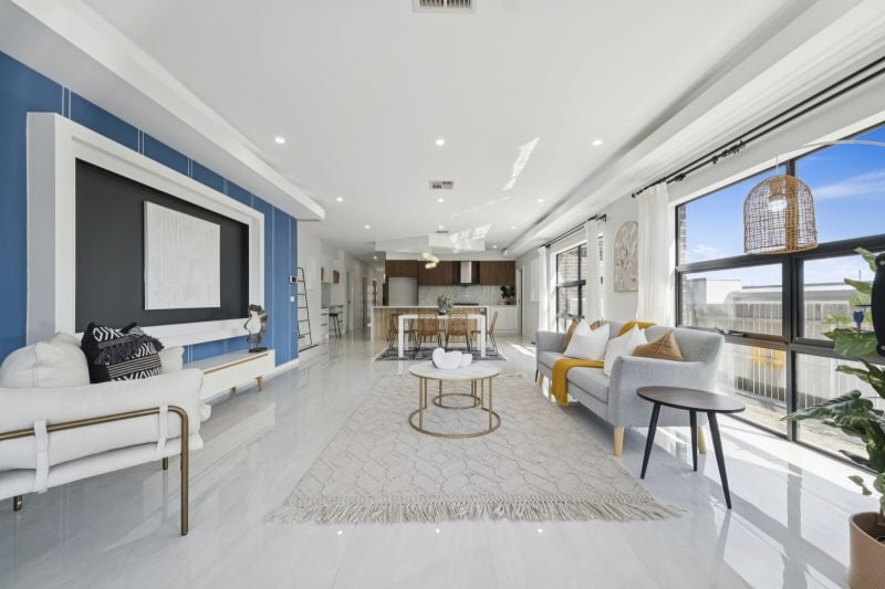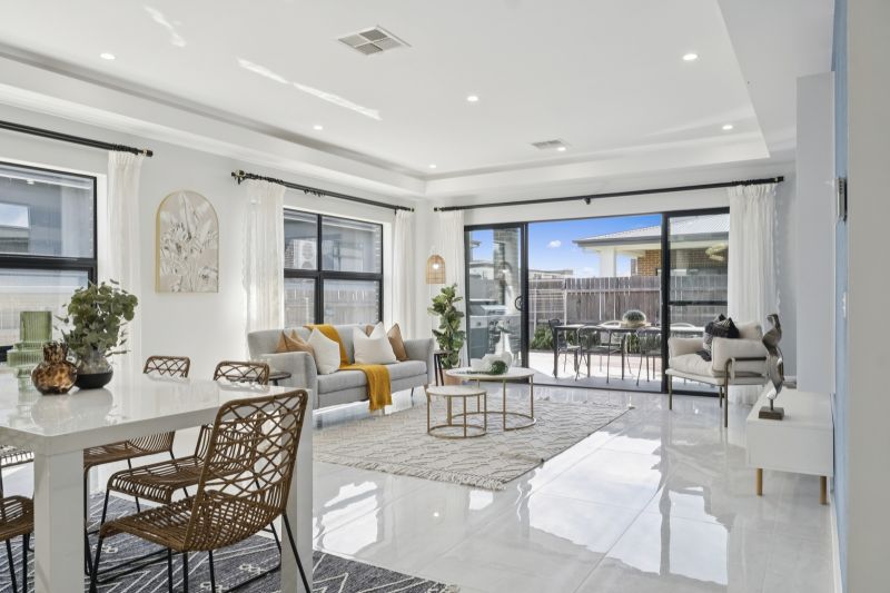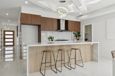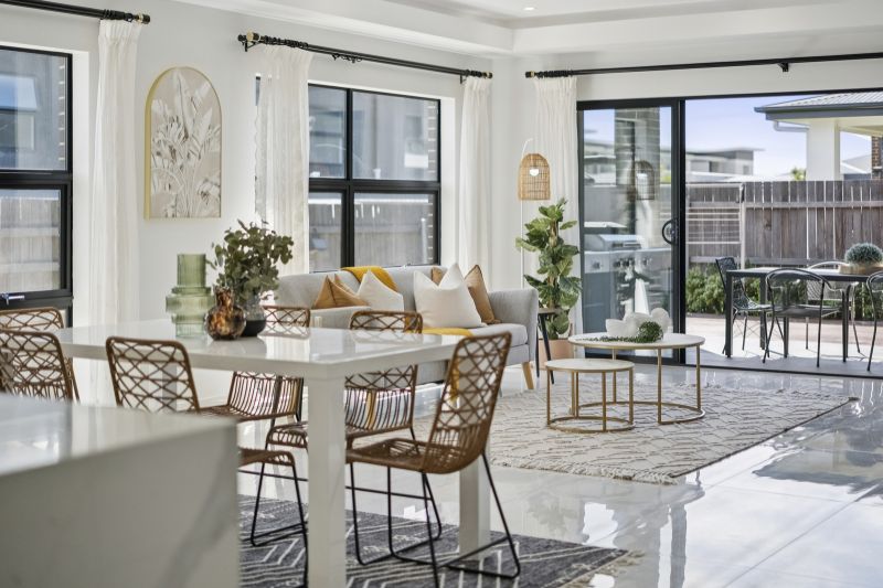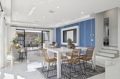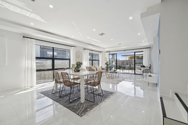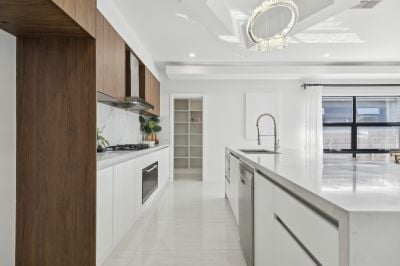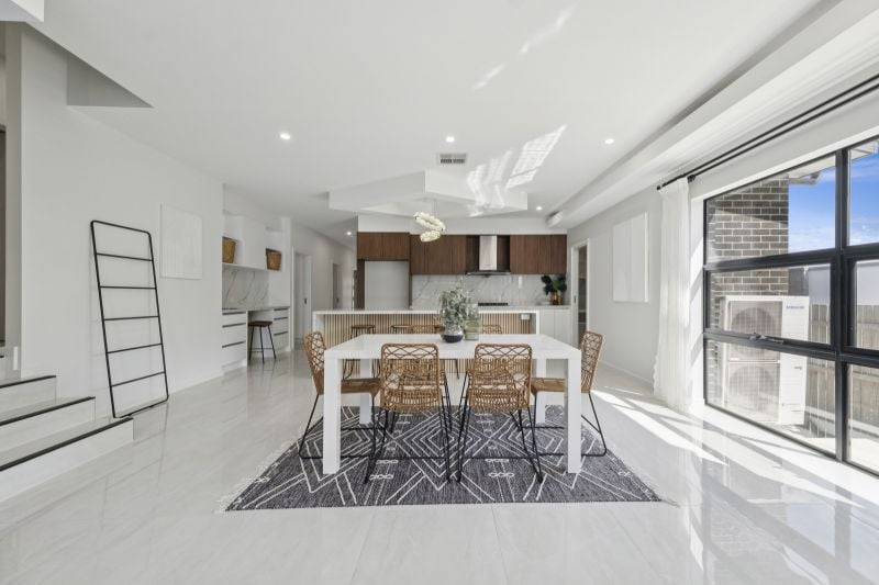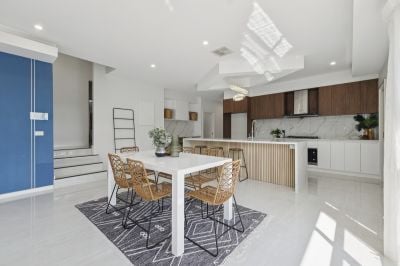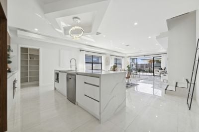 Occupying a generous 443 square metre parcel of land, this four-bedroom, three-bathroom masterpiece is tailored to meet the needs of growing families. The home boasts a fluid open-plan layout with expansive living and dining areas bathed in natural light, complemented by a private front lounge for secluded relaxation.