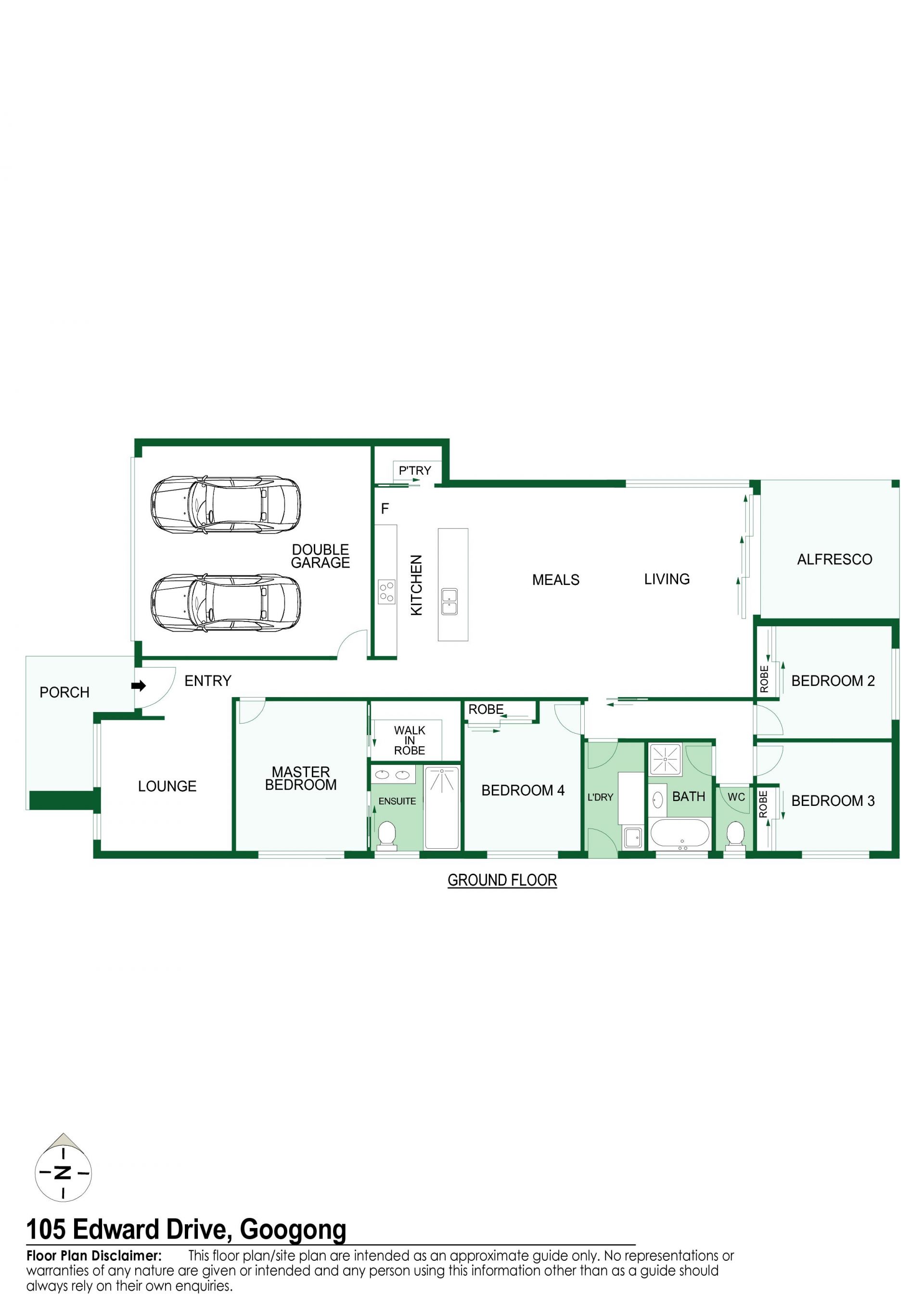 The segregated master bedroom comes complete with a walk-in robe and ensuite featuring his and hers vanities. The rest 3 more bedrooms with built-in robes are situated at the back of the house. The main bathroom, offering a shower and a back-to-wall free standing bath, is conveniently positioned in between them.